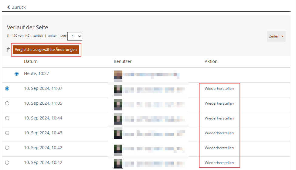 Den Verlauf können Sie aufrufen, indem Sie die Bearbeitung der gewünschten Seite starten, und dann im Aktionsmenü auf die Option “Verlauf” klicken. Anschließend werden Ihnen alle Versionen der Seite angezeigt und Sie können diese vergleichen oder mit “Wiederherstellen” die Version wiederherstellen.