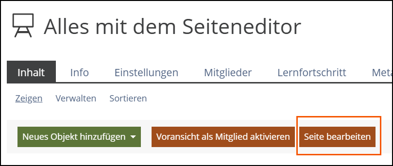 Der Seiteneditor kommt an den unterschiedlichsten Stellen in ILIAS zum Einsatz. In den meisten Fällen starten Sie den Seiteneditor, indem Sie auf den Button “Seite gestalten”, “Seite bearbeiten” oder auch “Inhalt bearbeiten” klicken.
