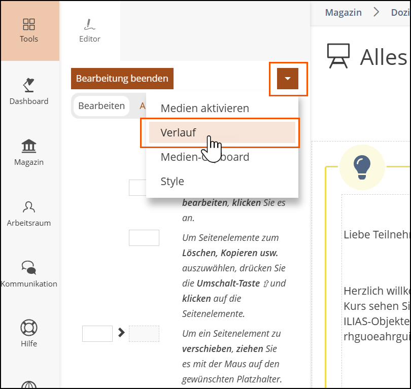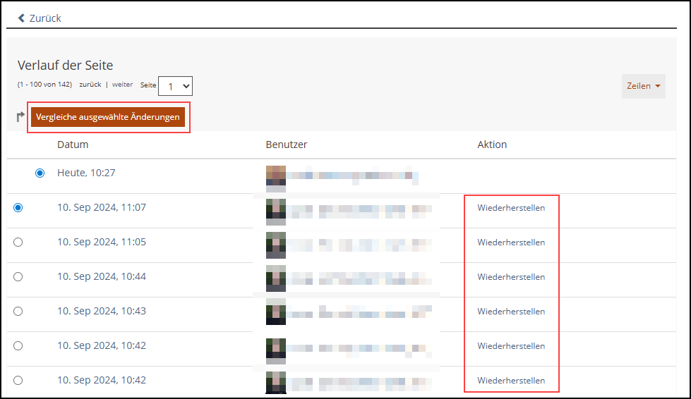 Den Verlauf können Sie aufrufen, indem Sie die Bearbeitung der gewünschten Seite starten, und dann im Aktionen-Menü auf die Option “Verlauf” klicken. Anschließend werden Ihnen alle Versionen der Seite angezeigt und Sie können diese vergleichen oder mit “Wiederherstellen” die gewünschte Version wiederherstellen.