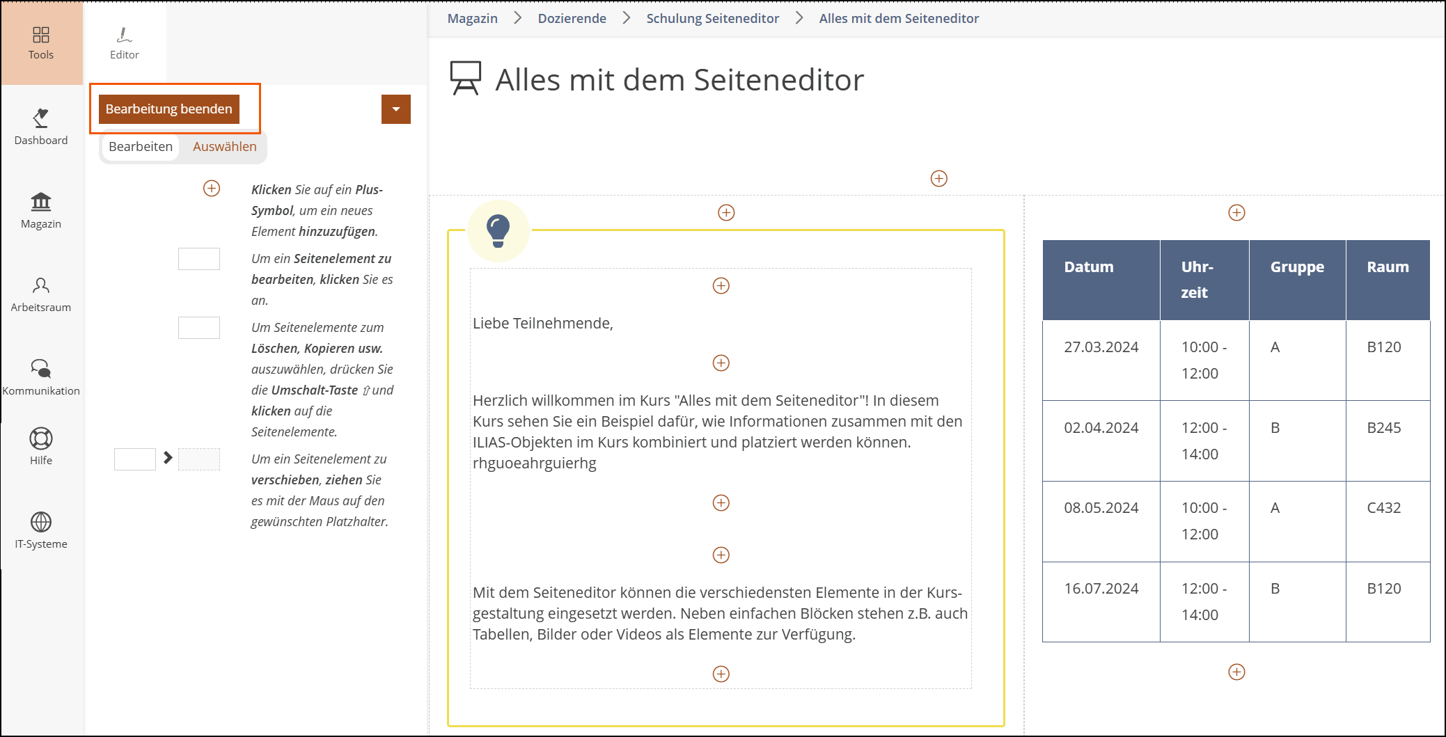 Wenn Sie die Bearbeitung beenden und den Seiteneditor verlassen möchten, klicken Sie dazu auf den Button “Bearbeitung beenden” oben links im Kontextmenü. So wird der letzte Stand noch einmal gespeichert.