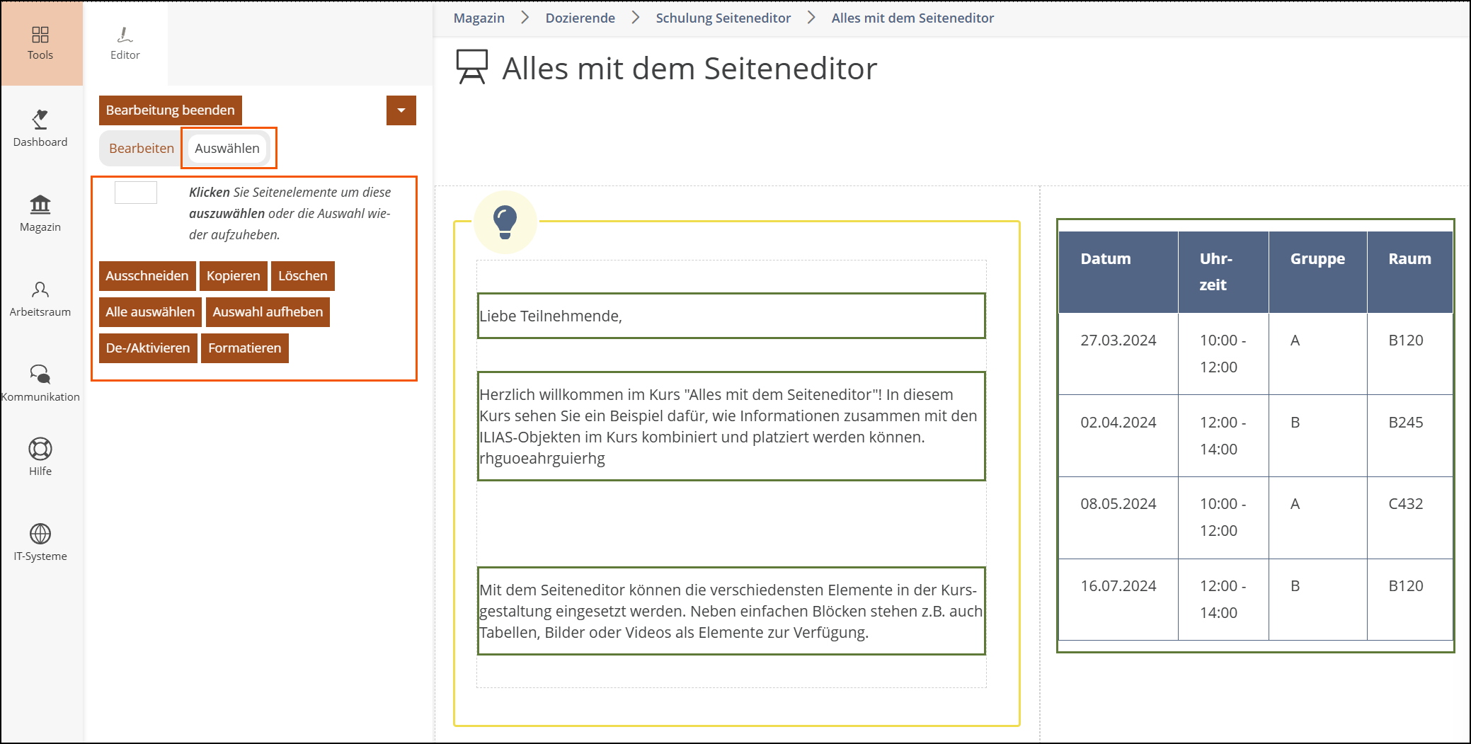 Zur Verwaltung der Elemente auf einer Seite verwenden Sie den Auswahlmodus. So können Sie mehrere Elemente gleichzeitig auswählen und beispielsweise kopieren, ausschneiden oder löschen. Ausgewählte Elemente sind im Auswahlmodus grün umrandet. Wenn Sie Elemente ausschneiden oder kopieren, werden diese in Ihrer persönlichen Zwischenablage gespeichert, damit Sie die Elemente an anderer Stelle wieder einfügen können. Dies muss nicht zwingend auf derselben Seite sein, sondern kann auch auf einer anderen Seite in ILIAS passieren.