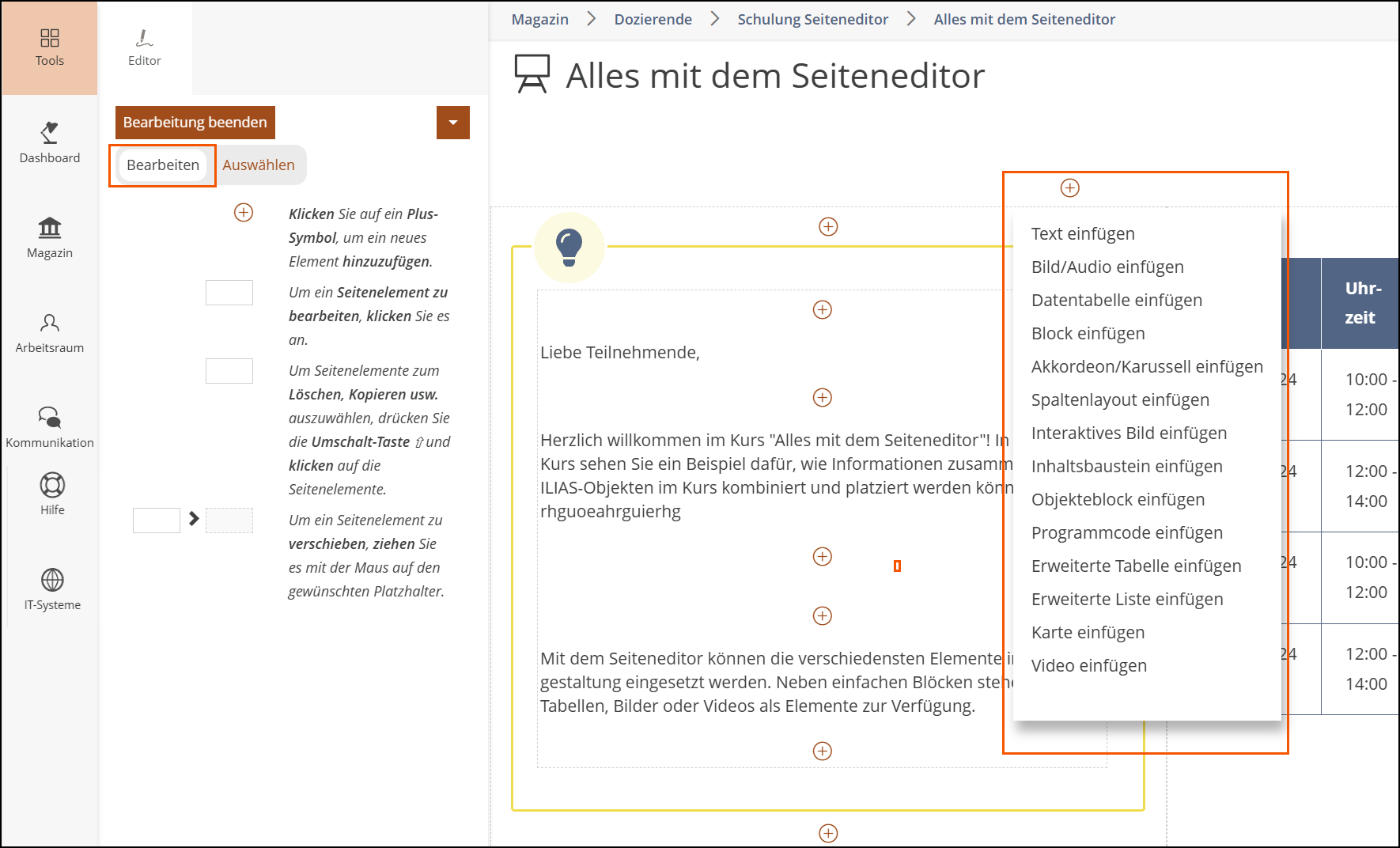 Im Anschluss sehen Sie auf der linken Seite im Kontextmenü die Funktionen des Seiteneditors und auf der rechte Seite, falls bereits vorhanden, bestehende Inhalte der Seite.