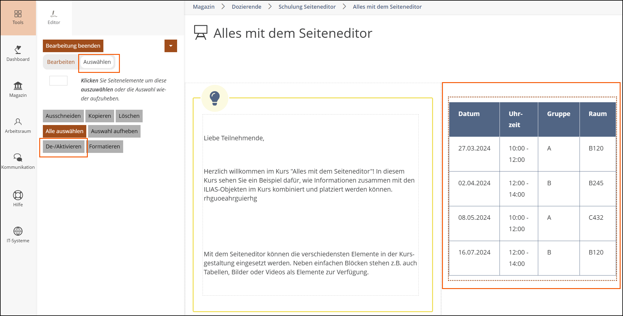 Bei der Verwendung des Auswahlmodus steht Ihnen der Button “De-/Aktivieren” zur Verfügung. Mit dieser praktischen Funktion können Sie bereits vorhandene Seitenelemente deaktivieren. Diese werden dann nicht mehr auf der Seite angezeigt, bleiben aber zur weiteren Bearbeitung in der Bearbeitungsansicht für Sie vorhanden und werden dort orange umrandet. Sobald Sie die Elemente wieder auf der Seite anzeigen lassen möchten, können Sie diese wieder aktivieren.