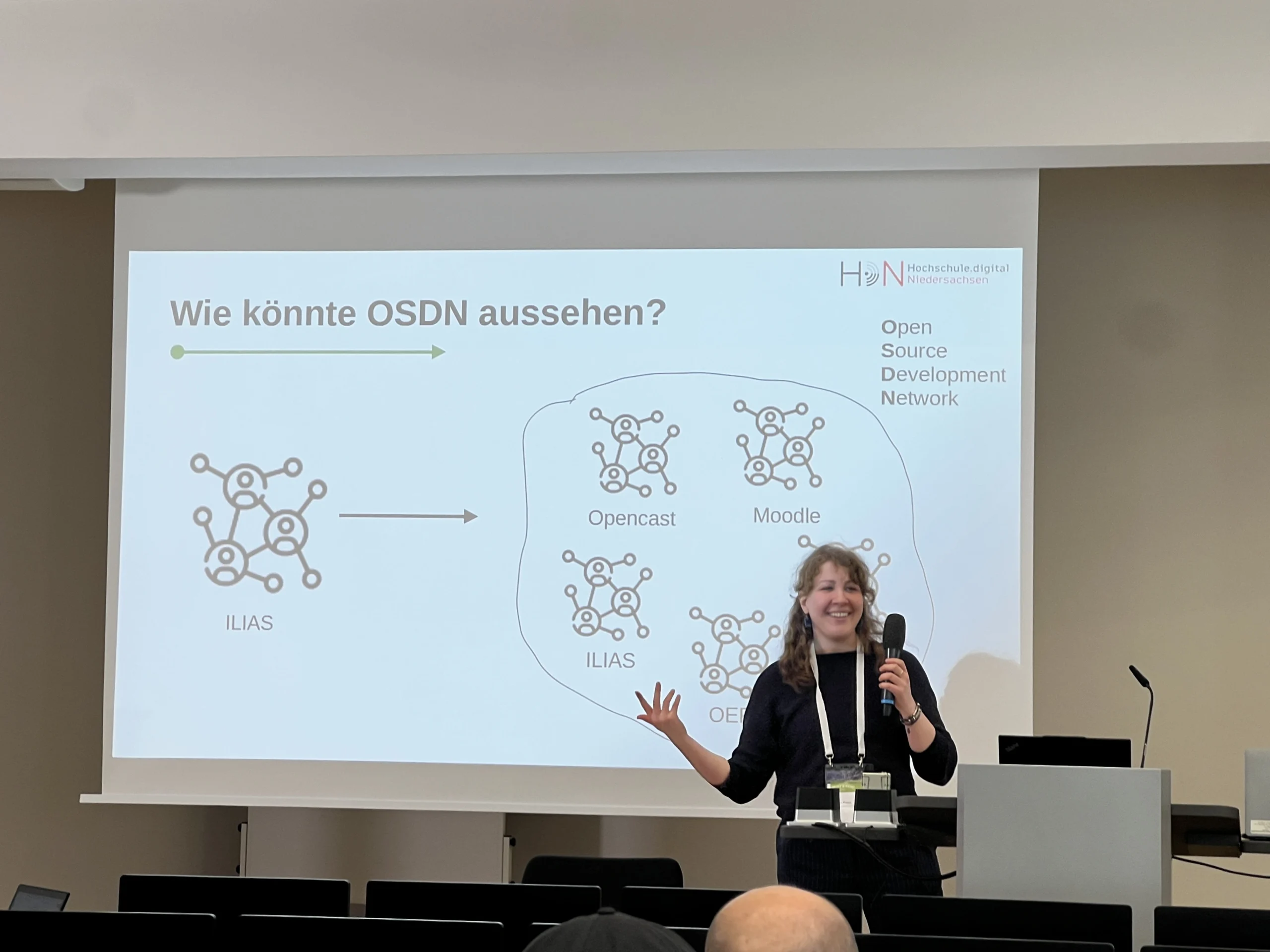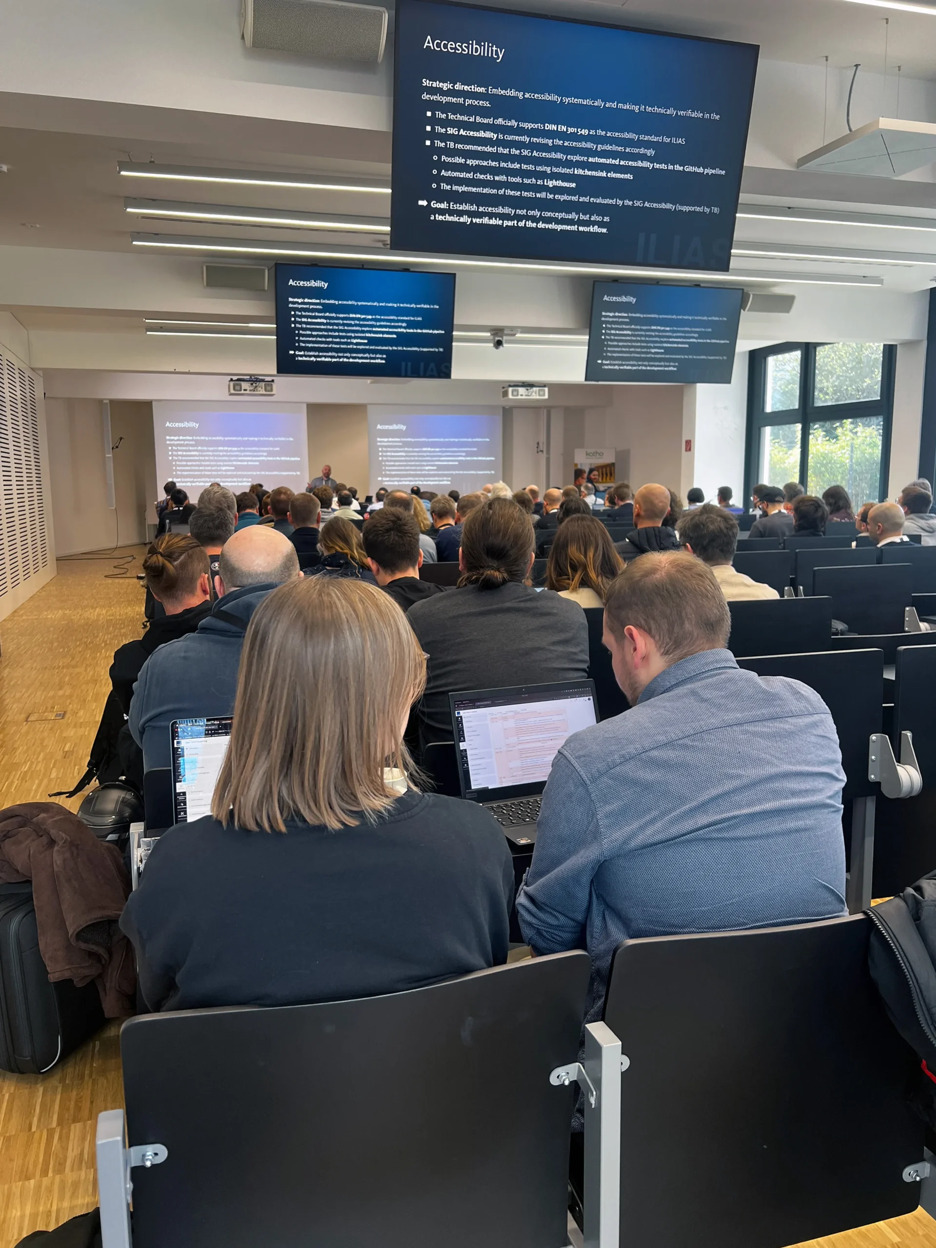 Der Vormittag endete mit zwei Vorträgen zu Barrierefreiheit und inklusiver Sprache – letzterer zu Verbesserungen im deutschen ILIAS-Sprachpaket (mehr dazu im Blogbeitrag auf ilias.nrw). Am Nachmittag fanden drei parallele Sessions mit vielfältigen Themen aus Entwicklung, Betrieb und Anwendung von ILIAS statt.