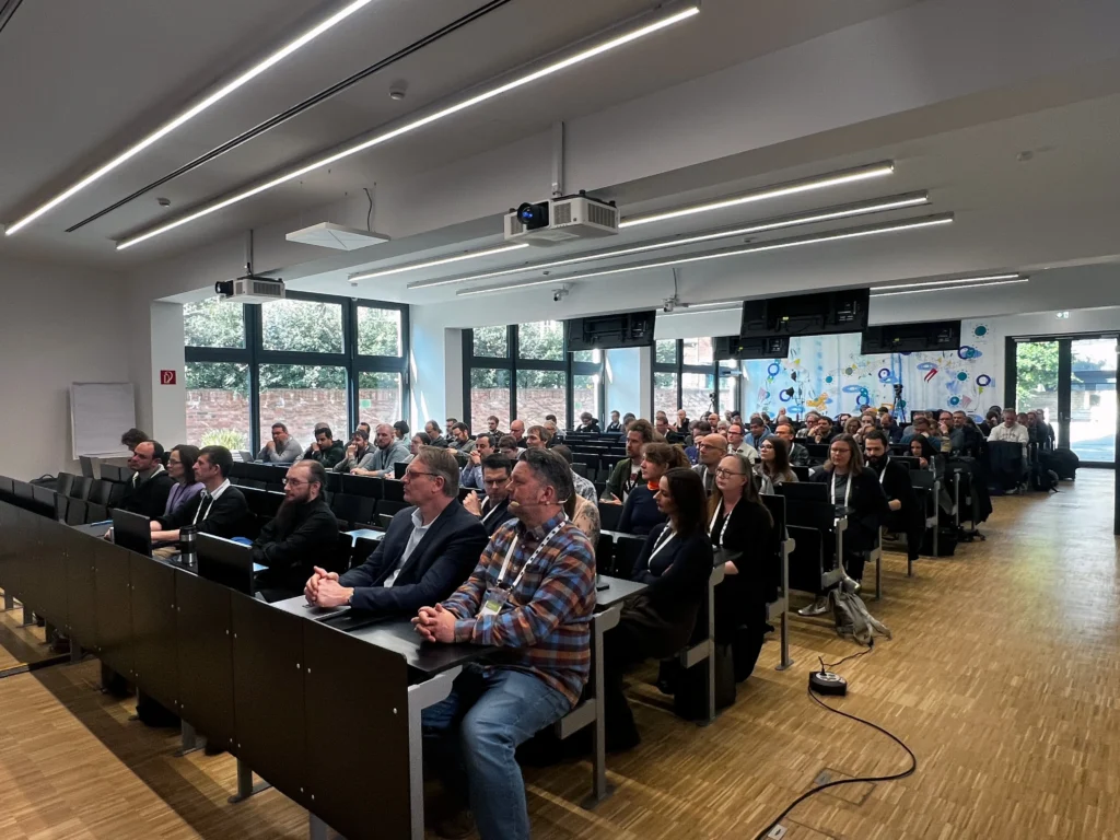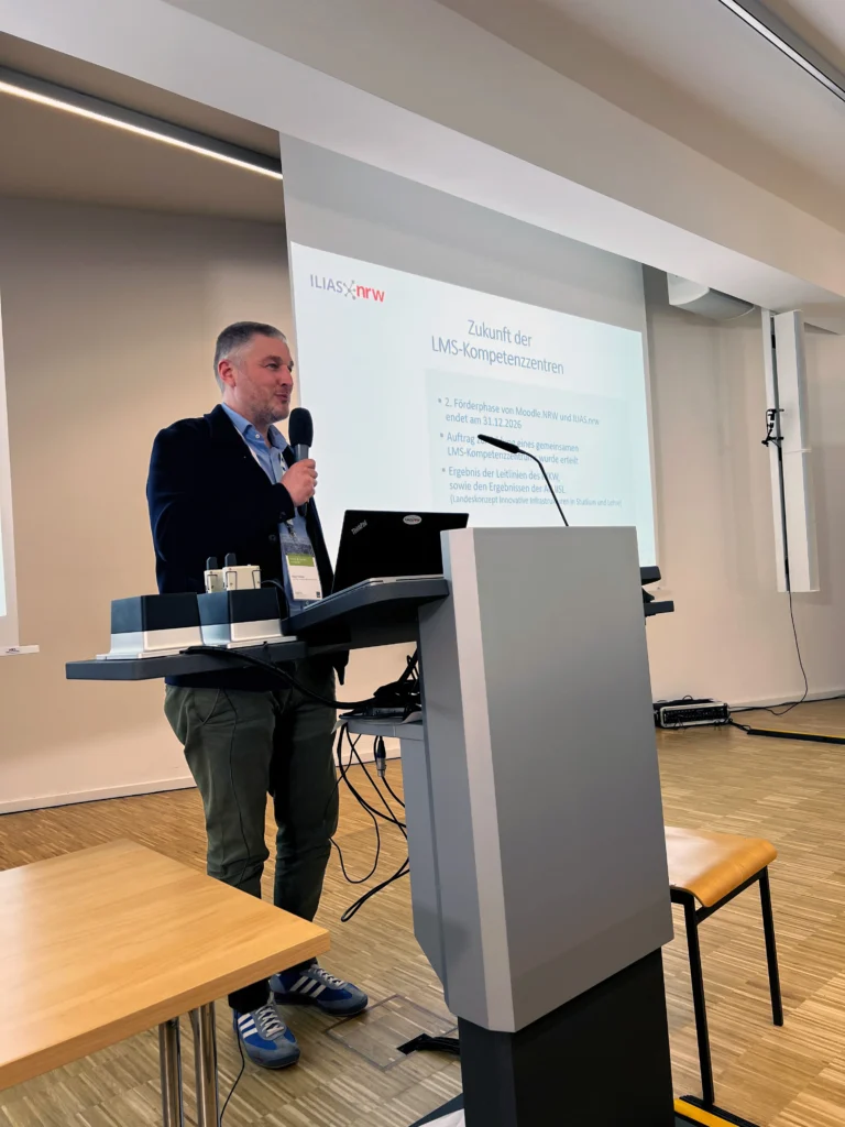 Der zweite Veranstaltungstag stand ganz im Zeichen der 45. Entwicklungskonferenz (DevConf). Mit über einhundert Teilnehmenden verdreifachte sich die Zahl der Anwesenden im Vergleich zum Vortag deutlich. Nach der Eröffnung durch Prof. Dr. Martin Klein (katho), Prorektor für Studium, Lehre und Weiterbildung, folgte zunächst ein Statusbericht zur Entwicklung von ILIAS. Vorgestellt wurde unter anderem die Roadmap der kommenden Versionen – etwa das geplante Release von ILIAS 11 im zweiten Quartal 2026 sowie der verlängerte Supportzeitraum für ILIAS 10 bis Juni 2027.