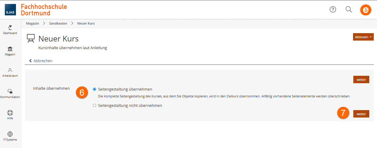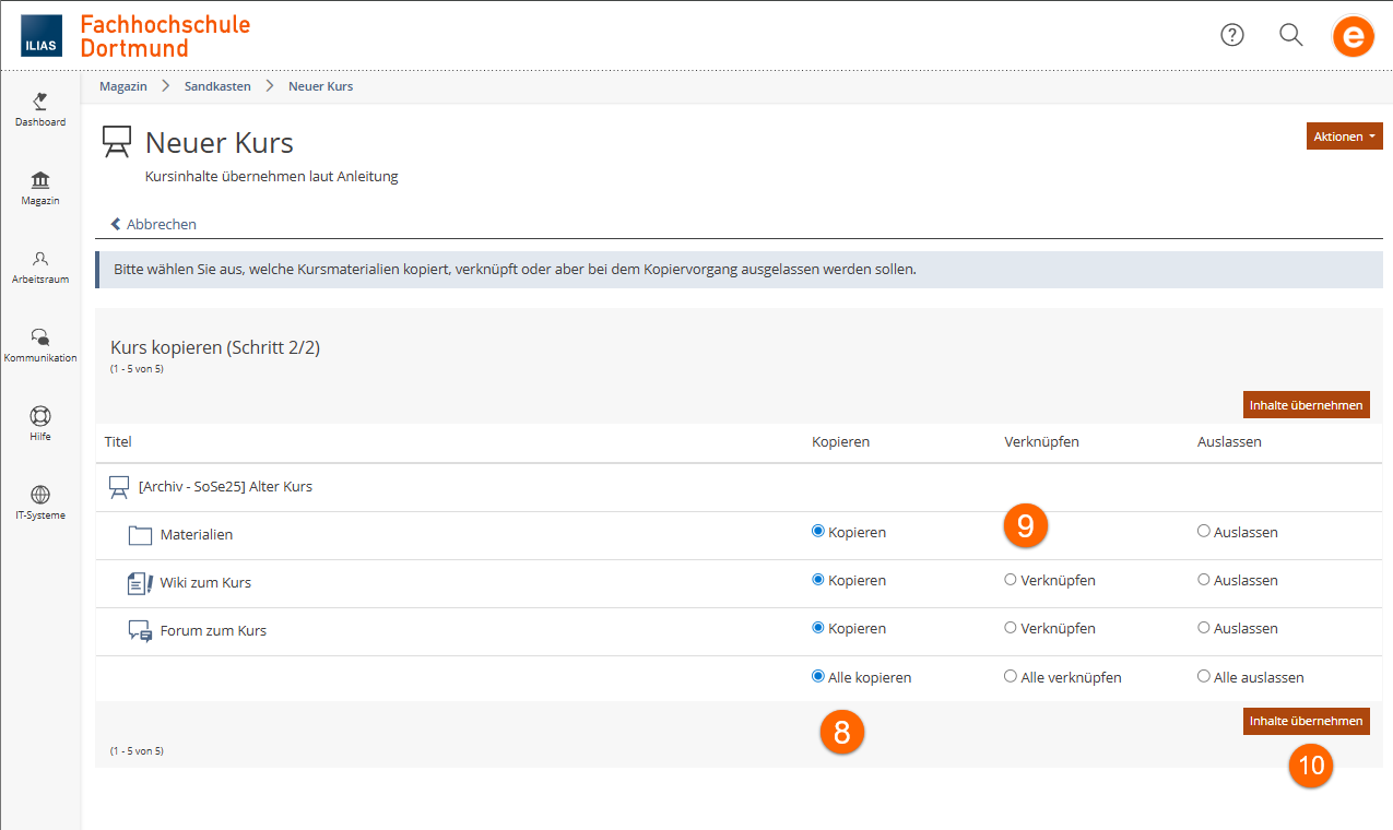 Im Zuge der Lehrveranstaltungsübertragung von HISinOne (portal.fh-dortmund.de) zu ILIAS (ilias.fh-dortmund.de) wird für jede Lehrveranstaltung ein ILIAS-Kurs erzeugt. Analog zur Planung in HISinOne geschieht dies semesterabhängig, d.h. es gibt in jedem Semester einen neuen Kurs für jede Lehrveranstaltung. Lehr- und Lerninhalte müssen daher in den meisten Fällen vom „alten“ in den „neuen“ Kurs übertragen werden.