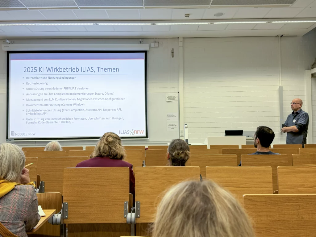 Neben dem Schwerpunktthema Künstliche Intelligenz (KI) bot das Programm spannende Einblicke in Projekte wie STACK.nrw, MIau.nrw und auch über den Tellerrand NRWs hinaus in Initiativen aus Baden-Württemberg. Auch das ILIAS-Kompetenzzentrum der FH Dortmund war mit einem Beitrag vertreten: zum HISinOne-Proxy, einer Lösung zur Verbindung des LMS ILIAS mit dem Campus-Management-System HISinOne.